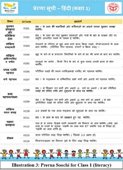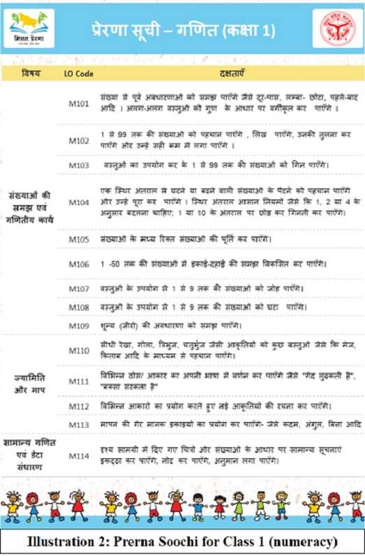 In September 2019, the Chief Minister of Uttar Pradesh, Yogi Adityanath, launched Mission Prerna with the singular objective of ensuring that the state’s 1.2 crore primary school students in government schools achieve foundational learning skills by 2022. The state government has set quantifiable goals for classes 1-5 to be achieved by more than 1.5 lakh schools. These goals for literacy and numeracy are listed in a document called the ‘Prerna Lakshya’ (Illustration 1). The relevance and importance of this document is recognized by education department officials and teachers alike in the state. A third-party will assess the performance of students against this goal periodically. Successful attainment of the Lakshya would mean that the child has acquired all learning outcomes listed in the overall outcome framework.