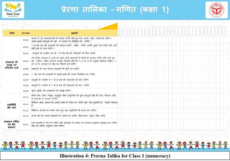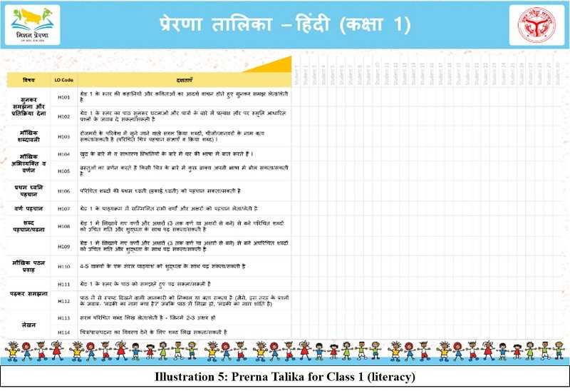 As the focus shifts to learning outcomes-based teaching inside the classroom, a child’s progress will have to be recorded and assessed along the same lines. Therefore, to ensure that the teachers record progress made by each child against the desired learning outcomes, a ‘Prerna Talika’, a spreadsheet of names of students inside the classroom listed against learning outcomes has also been developed (Illustrations 4 and 5). Along with the ‘Prerna Lakshya’ and ‘Prerna Soochi’, the ‘Prerna Talika’ is also being pasted in all classrooms to ensure the achievement of milestones’ gets celebrated, recorded and monitored.
