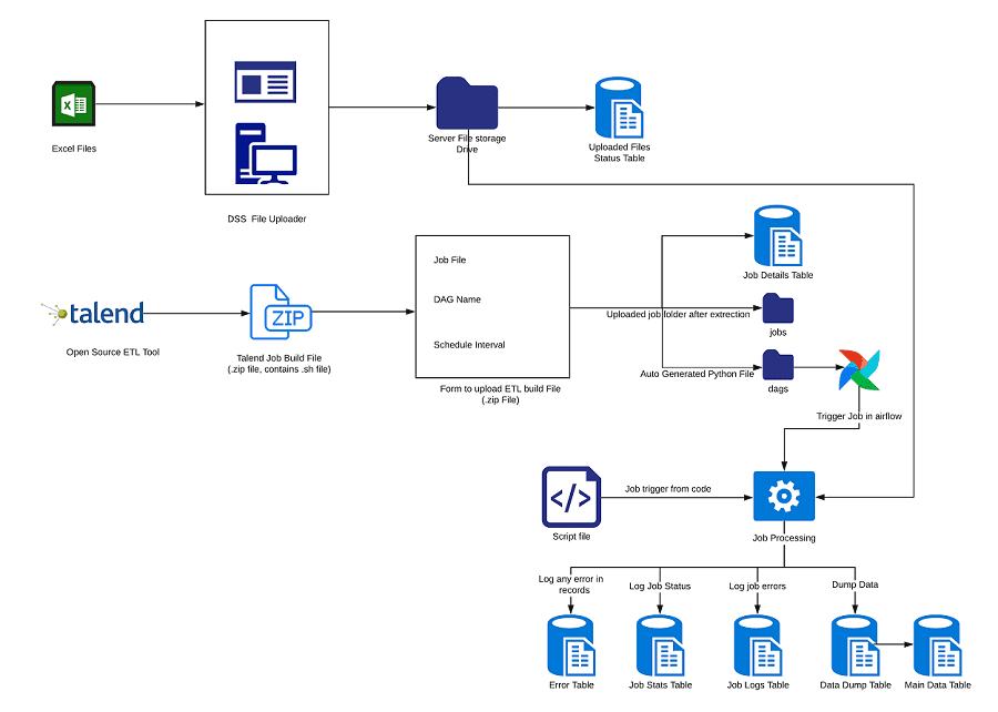 The following diagram provides an overview of the architecture of working of file uploads on DSS: